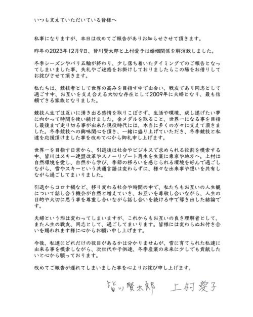 ・日刊スポーツ 上村愛子さん、23年12月に離婚原因 https://www.nikkansports.com/sports/news/202410020000623.html
